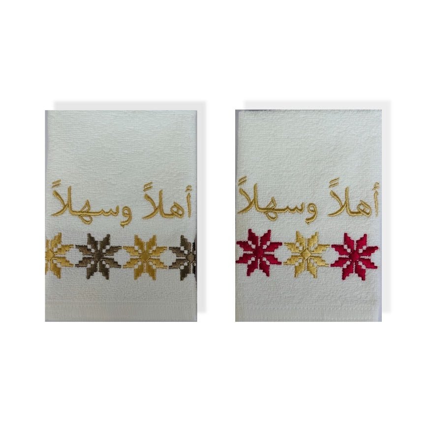 Adding an attractive touch to your guest bathroom with this embroidered Welcome (اهلا وسهلا) set of 2 embroidered hand towel.